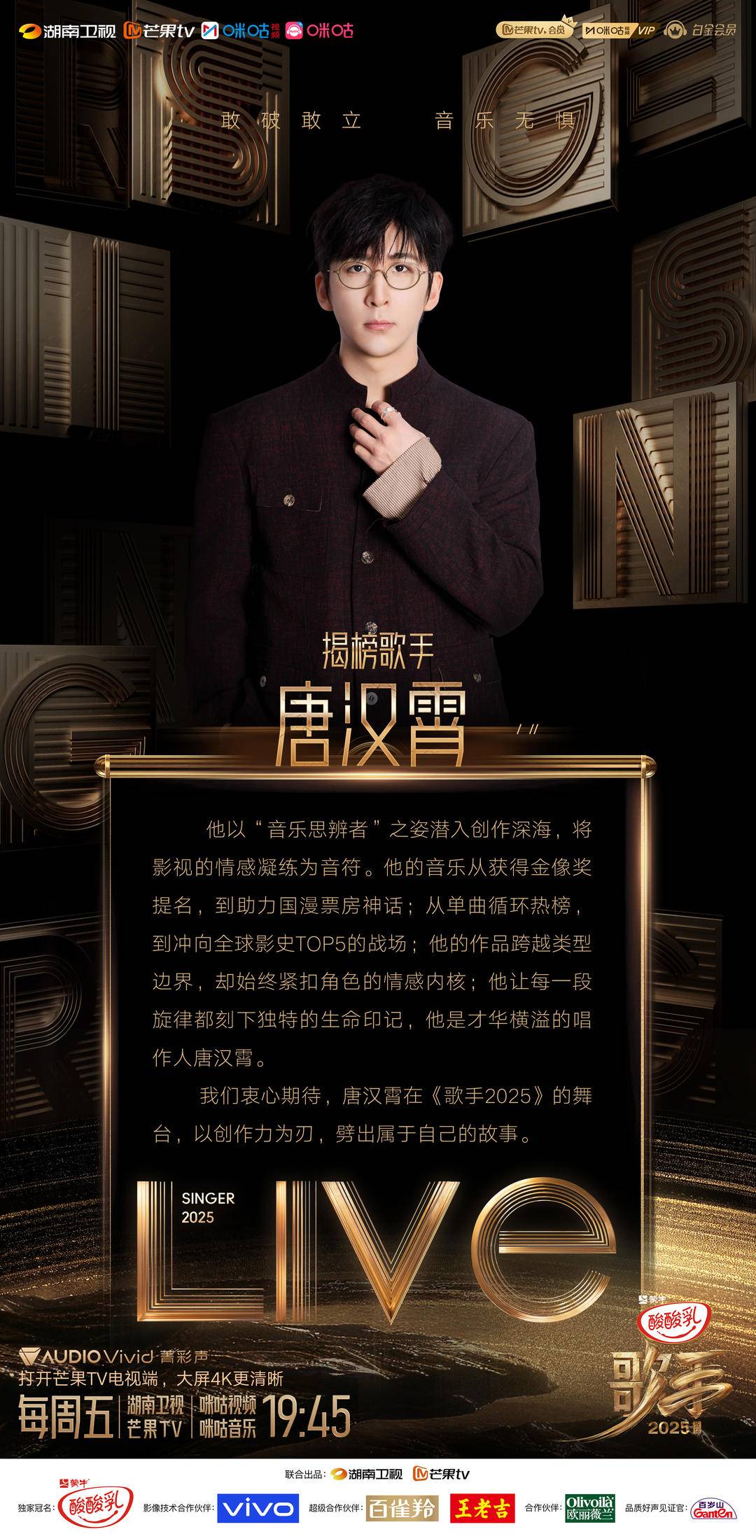 “你可能不认识唐汉霄但⼀定听过他创作的歌”,但唐汉霄也有歌红⼈不红的困扰,这也是他这次来《歌⼿》想去探索的⽬的。“像要打开⼀扇⻔,⻔后有我想要去的地⽅,也同样有很多的危险,但⼈⽣就⼀次,为什么不试试,怕什么。”作为创作型歌⼿,⾯对直播舞台,唐汉霄说,“⼀定会担⼼发挥,但我只能尽我所能,因为对于呈现‘完美的演绎’来说,我更希望我能‘讲好⼀个故事’。”既然是来揭榜,总要放句狠话,“我没有狠话,希望⼤家能唱出⾃⼰的状态,⾄于结果,交给上天去安排,不过还好,我命由我不由天。”